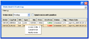 Each pending order can be canceled or edited in order to modify some parameters. From the view "Order book & Trade Log", right click on the order and select the appropriate action.
