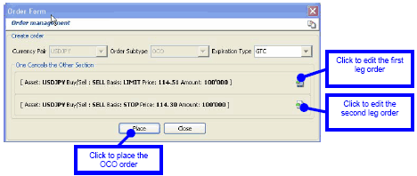 An OCO order is a mixture of one limit- and one stop orders. 2 orders with price and duration variable are placed above and below the current price. When one of the orders is executed the other order is cancelled. To illustrate how an OCO order works let's take the following example: The price of USDJPY is 114.41. Trader x wants to either sell 100'000 at 114.30 below the resistance level in anticipation of a breakout or initiate a selling position if the price reach 114.51.