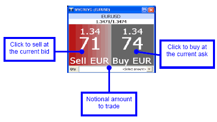 The most common way to place a market order (Spot) is to use the WYCIWYG box. The real time bid/ask prices appear in the trading box for each currency-pair. A client has just to click on the current bid or ask offer for executing the trade.