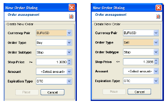 Example: Trader x sees EURUSD breaking through the 1.3090 resistance level. He believes that if this happens, the price of EURUSD could be headed to 1.3150 and over. At this point the market is at 1.3050 so trader x places an order to initiate a buying position of 500'000 at 1.3090 'on stop'.