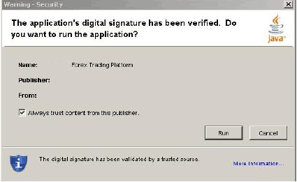 After the first login, the trader is asked to trust the Amerex Java Platform. Please check the authenticity of the signature made by: Verisign Inc. If the verification is correct (like described on the screenshot below), press Run.